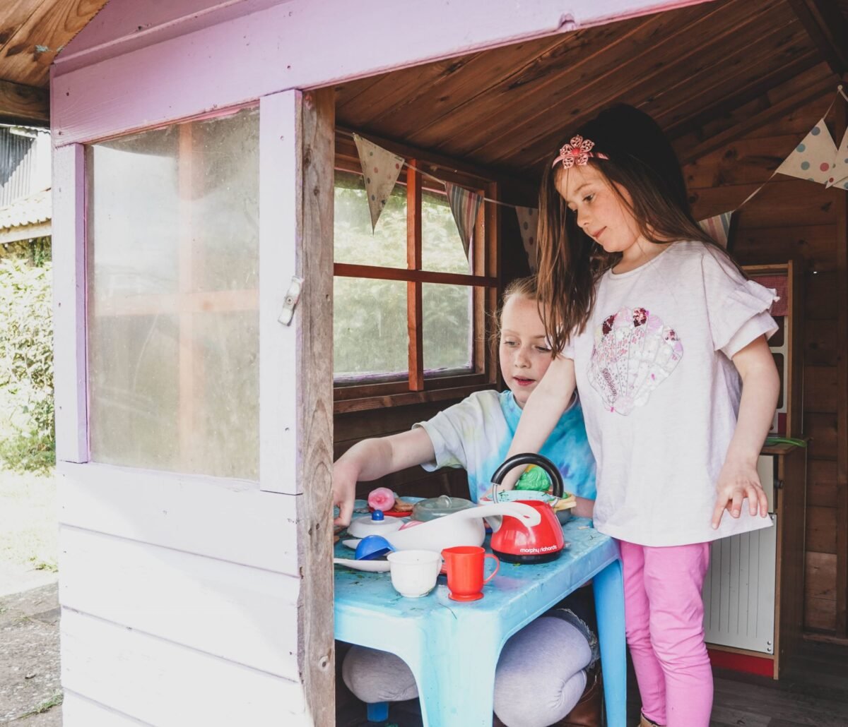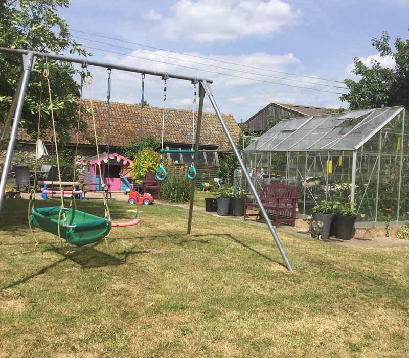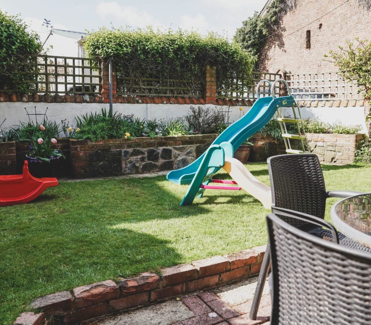 A delightful courtyard area hosts a raised Wendy house with a slide and a fun mud and water kitchen, guaranteeing hours of imaginative play. In the larger Orchard Garden, children can enjoy a bigger Wendy house, swings, slides, and various ride-on toys, all while you relax at the large granite dining table, perfect for enjoying a barbecue on a sunny evening.